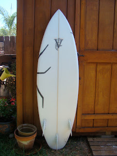 Chris, the new owner of board#013 wanted a 5'10 short board which would have great manoeuvrability in medium sized waves coupled with easy paddling. We both went "shopping" in the local surf shops (I go with a camera, ruler and notepad... and I take lots of measurements). He picked the Motorboat model designed by Rob Machado for Channel Islands. Few weeks later, here is my version of the Motorboat: small rocker for the best water/board contact (for paddling), a lot of volume specially towards the nose with a very very flat deck, double concave and of course, a custom design.